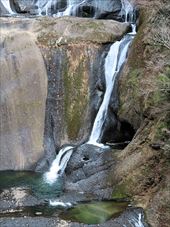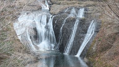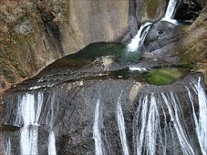 袋田の滝 2026年の1月2日は、まったく氷の気配無し。 水量も少ない感じだった。 これがたぶん、ハートに見える部分かな? 中段の滝壺。 流れ方が複雑だ。 甌穴なんかもある。 滝の横顔。 トンネル内の鑑瀑台が見える。 こんな感じで岩山に阻まれて 直角に流れが変わっている。 これ、生瀬の滝に行く階段から撮影。 袋田の滝の上流の流れ。 生瀬の滝 こちらも水量が少ない感じ。 左右のバランスがよくなくて、 いつも通りのハート型に見えない。 滝壺に流れが映る。 滝上のアップ。 雪が舞っているのがわかるかな? |